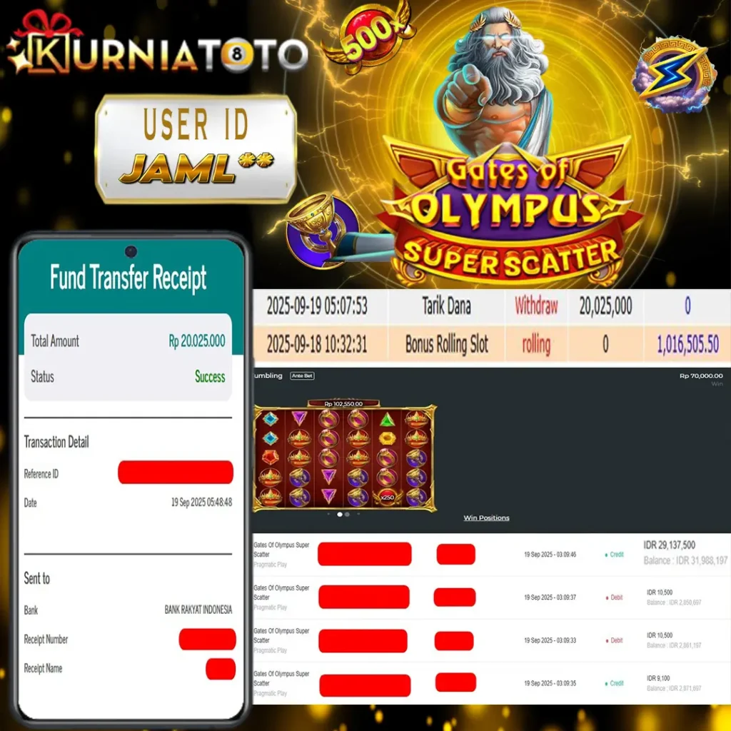 Selamat kepada member setia KURNIATOTO ID JAML** Telah menang dalam permainan SLOT GATES OF OLYMPUS SUPER SCATTER RP 20,025,000, – LUNAS langsung mendarat ke rekening tanpa bertele – tele atau syarat apapun. Kami ucapkan terimakasih telah mempercayakan KURNIATOTO sebagai situs bandar terpercaya yang dijamin aman dikarenakan berapapun kemenangan member pasti LUNAS!