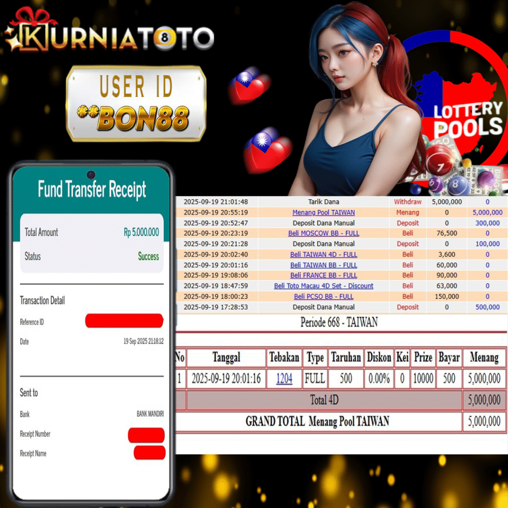 Selamat kepada member setia KURNIATOTO ID **BON88 Telah menang dalam permainan TAIWAN POOLS RP 5,000,000, – LUNAS langsung mendarat ke rekening tanpa bertele – tele atau syarat apapun. Kami ucapkan terimakasih telah mempercayakan KURNIATOTO sebagai situs bandar terpercaya yang dijamin aman dikarenakan berapapun kemenangan member pasti LUNAS!