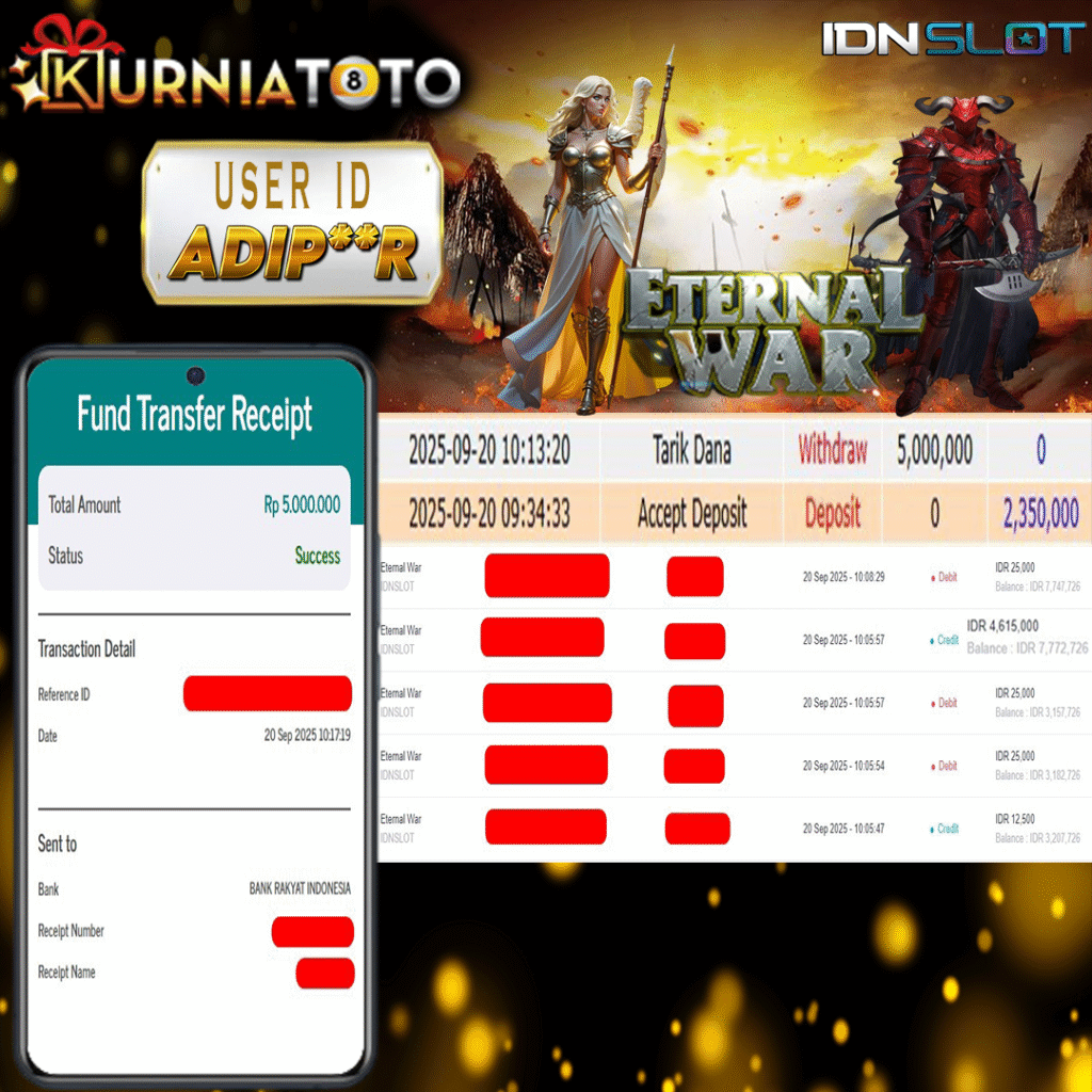 Selamat kepada member setia KURNIATOTO ID ADIP**R Telah menang dalam permainan SLOT ETERNAL WARS RP 5,000,000 – LUNAS langsung mendarat ke rekening tanpa bertele – tele atau syarat apapun. Kami ucapkan terimakasih telah mempercayakan KURNIATOTO sebagai situs bandar terpercaya yang dijamin aman dikarenakan berapapun kemenangan member pasti LUNAS!