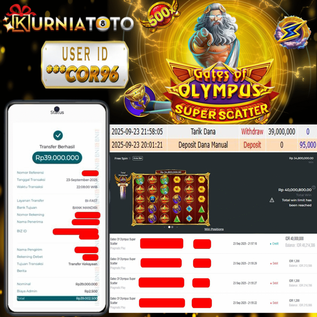 Selamat kepada member setia KURNIATOTO ID ***COR96 Telah menang dalam permainan SLOT GATES OF OLYMPUS SUPER SCATTER RP 39,000,000, – LUNAS langsung mendarat ke rekening tanpa bertele – tele atau syarat apapun. Kami ucapkan terimakasih telah mempercayakan KURNIATOTO sebagai situs bandar terpercaya yang dijamin aman dikarenakan berapapun kemenangan member pasti LUNAS!