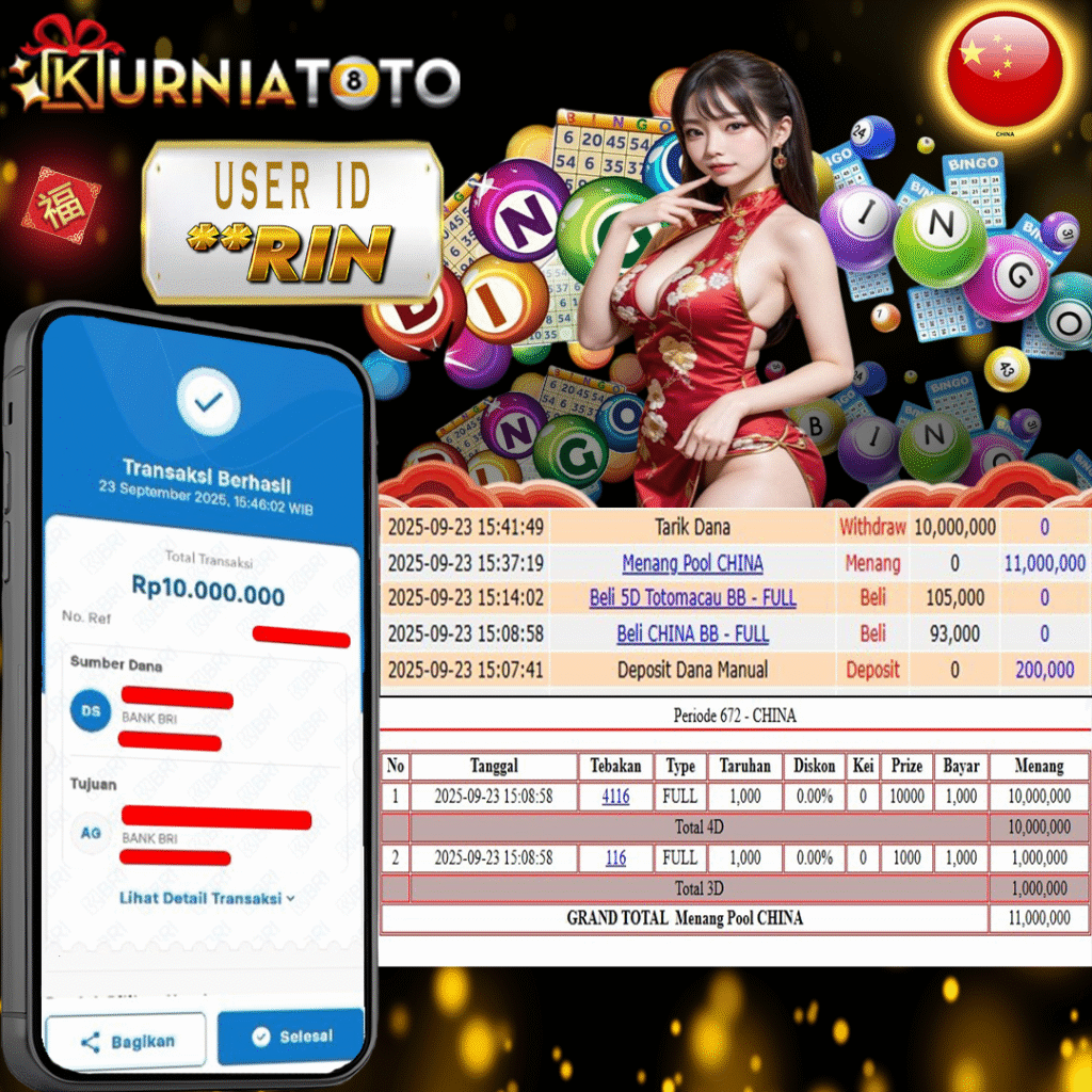 Selamat kepada member setia KURNIATOTO ID **RIN Telah menang dalam permainan CHINA POOLS RP 10,000,000, – LUNAS langsung mendarat ke rekening tanpa bertele – tele atau syarat apapun. Kami ucapkan terimakasih telah mempercayakan KURNIATOTO sebagai situs bandar terpercaya yang dijamin aman dikarenakan berapapun kemenangan member pasti LUNAS!