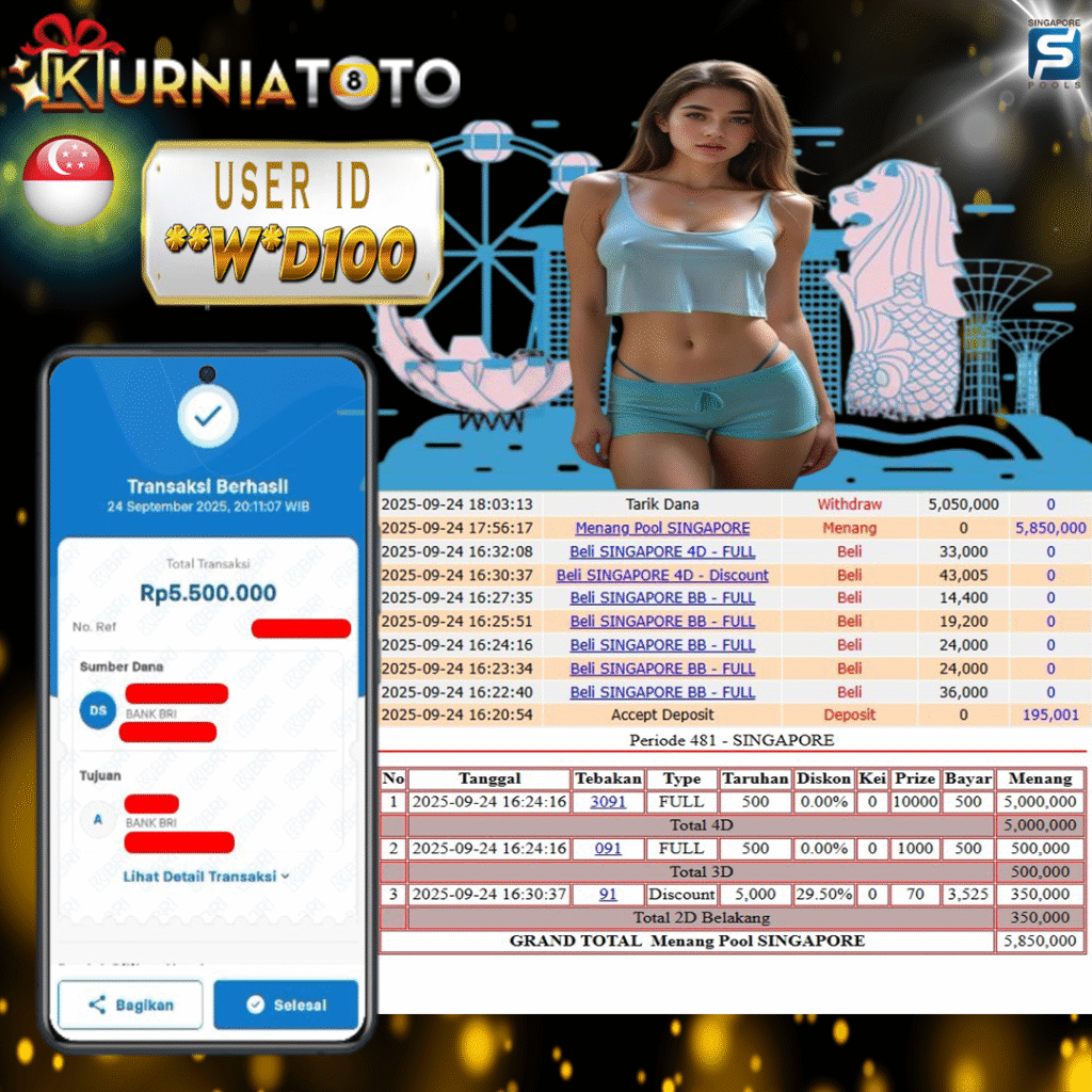 Selamat kepada member setia KURNIATOTO ID **W*D100 Telah menang dalam permainan SINGAPORE POOLS RP 5,500,000, – LUNAS langsung mendarat ke rekening tanpa bertele – tele atau syarat apapun. Kami ucapkan terimakasih telah mempercayakan KURNIATOTO sebagai situs bandar terpercaya yang dijamin aman dikarenakan berapapun kemenangan member pasti LUNAS!