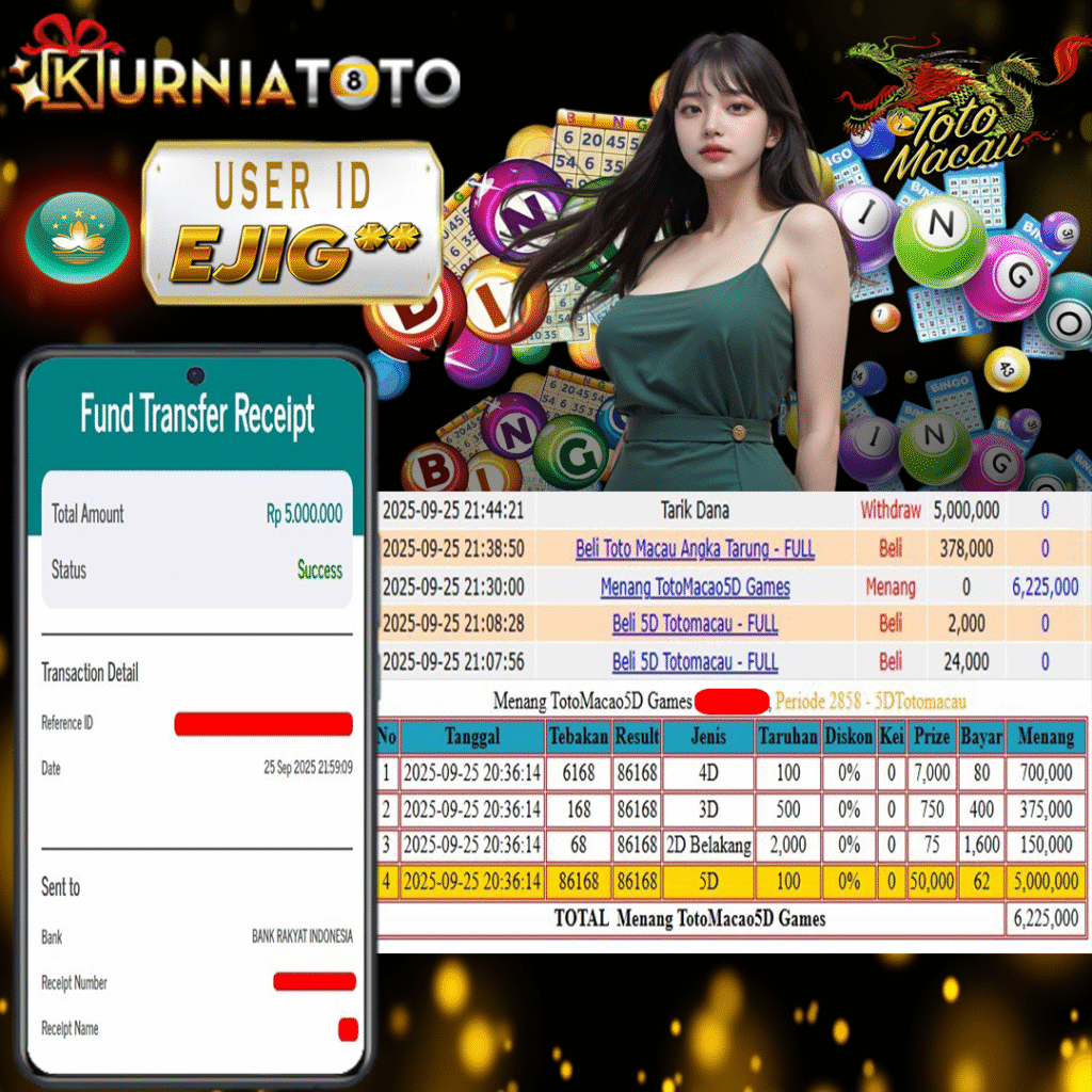 Selamat kepada member setia KURNIATOTO ID EJIG** Telah menang dalam permainan TOTO MACAU 5D RP 5,000,000, – LUNAS langsung mendarat ke rekening tanpa bertele – tele atau syarat apapun. Kami ucapkan terimakasih telah mempercayakan KURNIATOTO sebagai situs bandar terpercaya yang dijamin aman dikarenakan berapapun kemenangan member pasti LUNAS!