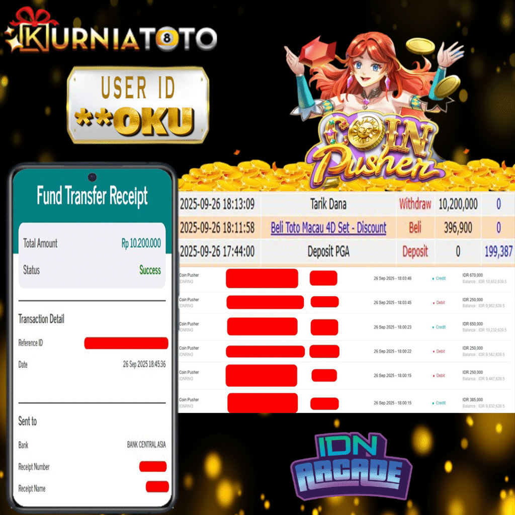 Selamat kepada member setia KURNIATOTO ID **OKU Telah menang dalam permainan IDN ARCADE COIN PUSHER RP 10,200,000, – LUNAS langsung mendarat ke rekening tanpa bertele – tele atau syarat apapun. Kami ucapkan terimakasih telah mempercayakan KURNIATOTO sebagai situs bandar terpercaya yang dijamin aman dikarenakan berapapun kemenangan member pasti LUNAS!
