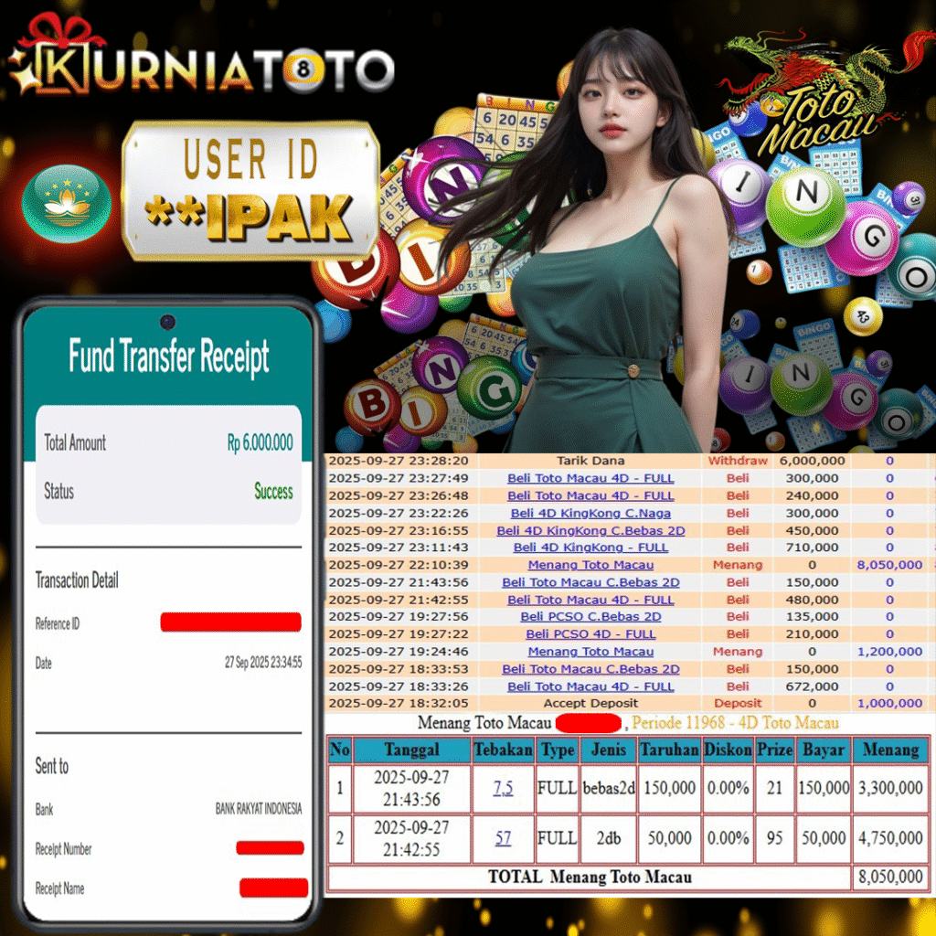 Selamat kepada member setia KURNIATOTO ID **IPAK Telah menang dalam permainan TOTO MACAU RP 6,000,000, – LUNAS langsung mendarat ke rekening tanpa bertele – tele atau syarat apapun. Kami ucapkan terimakasih telah mempercayakan KURNIATOTO sebagai situs bandar terpercaya yang dijamin aman dikarenakan berapapun kemenangan member pasti LUNAS!