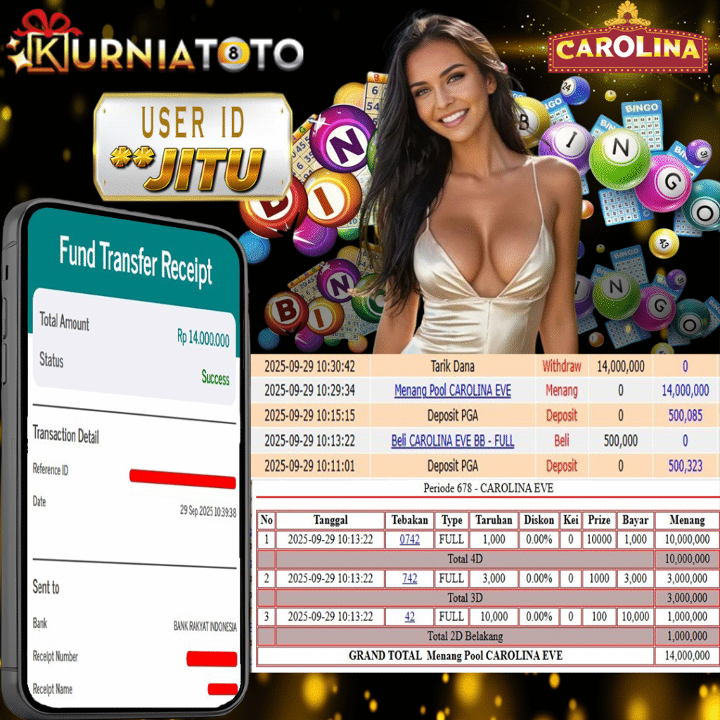 Selamat kepada member setia KURNIATOTO ID **JITU Telah menang dalam permainan CAROLINA EVE POOLS RP 14,000,000, – LUNAS langsung mendarat ke rekening tanpa bertele – tele atau syarat apapun. Kami ucapkan terimakasih telah mempercayakan KURNIATOTO sebagai situs bandar terpercaya yang dijamin aman dikarenakan berapapun kemenangan member pasti LUNAS!