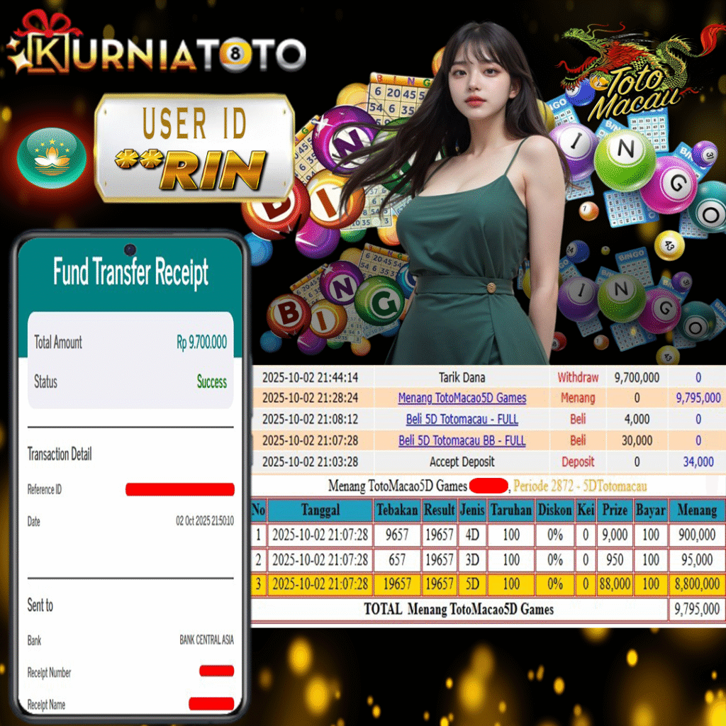 Selamat kepada member setia KURNIATOTO ID **RIN Telah menang dalam permainan Togel online TOTO MACAU 5 ANGKA RP 9,700,000, – LUNAS langsung mendarat ke rekening tanpa bertele – tele atau syarat apapun. Kami ucapkan terimakasih telah mempercayakan KURNIATOTO sebagai situs bandar terpercaya yang dijamin aman dikarenakan berapapun kemenangan member pasti LUNAS!