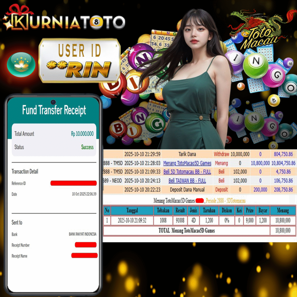 Selamat kepada member setia KURNIATOTO ID **RIN Telah menang dalam permainan TOTO MACAU 5D RP 10,000,000, – LUNAS langsung mendarat ke rekening tanpa bertele – tele atau syarat apapun. Kami ucapkan terimakasih telah mempercayakan KURNIATOTO sebagai situs bandar terpercaya yang dijamin aman dikarenakan berapapun kemenangan member pasti LUNAS!