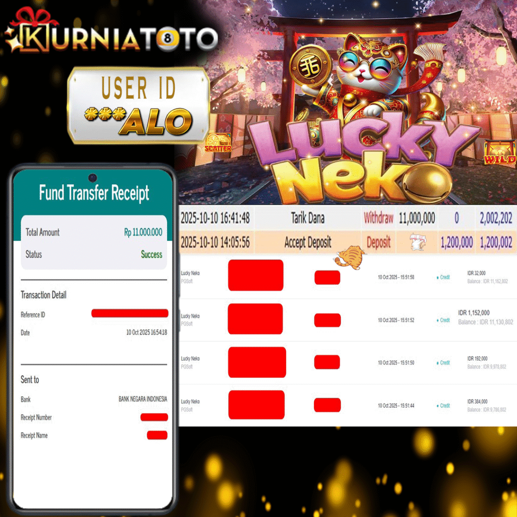 Selamat kepada member setia KURNIATOTO ID **ALO Telah menang dalam permainan SLOT LUCKY NEKO RP 11,000,000, – LUNAS langsung mendarat ke rekening tanpa bertele – tele atau syarat apapun. Kami ucapkan terimakasih telah mempercayakan KURNIATOTO sebagai situs bandar terpercaya yang dijamin aman dikarenakan berapapun kemenangan member pasti LUNAS!
