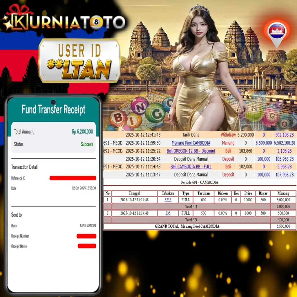 Selamat kepada member setia KURNIATOTO ID **LTAN Telah menang dalam permainan CAMBODIA POOLS 4D RP 6,200,000, – LUNAS langsung mendarat ke rekening tanpa bertele – tele atau syarat apapun. Kami ucapkan terimakasih telah mempercayakan KURNIATOTO sebagai situs bandar terpercaya yang dijamin aman dikarenakan berapapun kemenangan member pasti LUNAS!