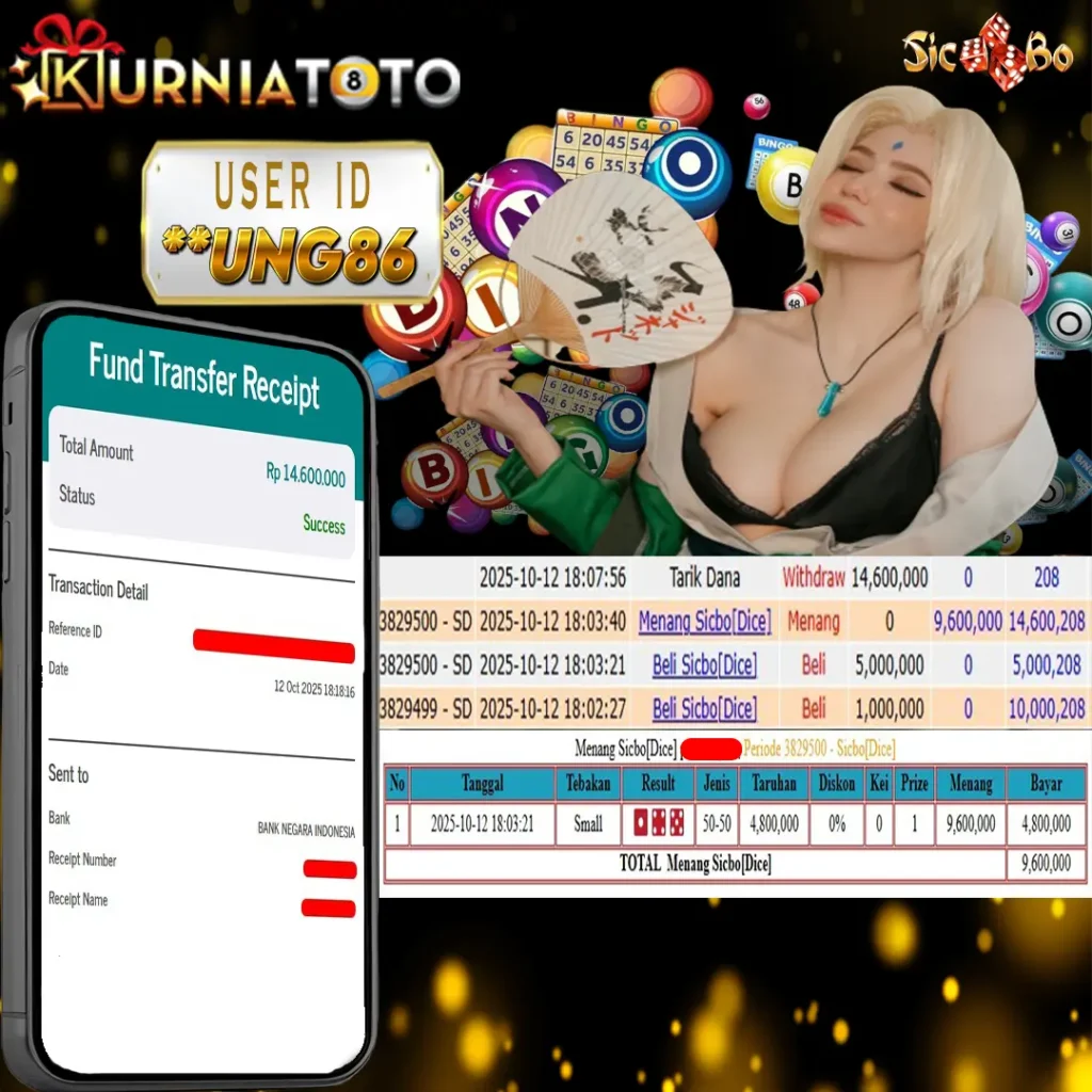 Selamat kepada member setia KURNIATOTO ID **UNG86 Telah menang dalam permainan LIVE GAMES SICBO [DICE] RP 14,600,000, – LUNAS langsung mendarat ke rekening tanpa bertele – tele atau syarat apapun. Kami ucapkan terimakasih telah mempercayakan KURNIATOTO sebagai situs bandar terpercaya yang dijamin aman dikarenakan berapapun kemenangan member pasti LUNAS!