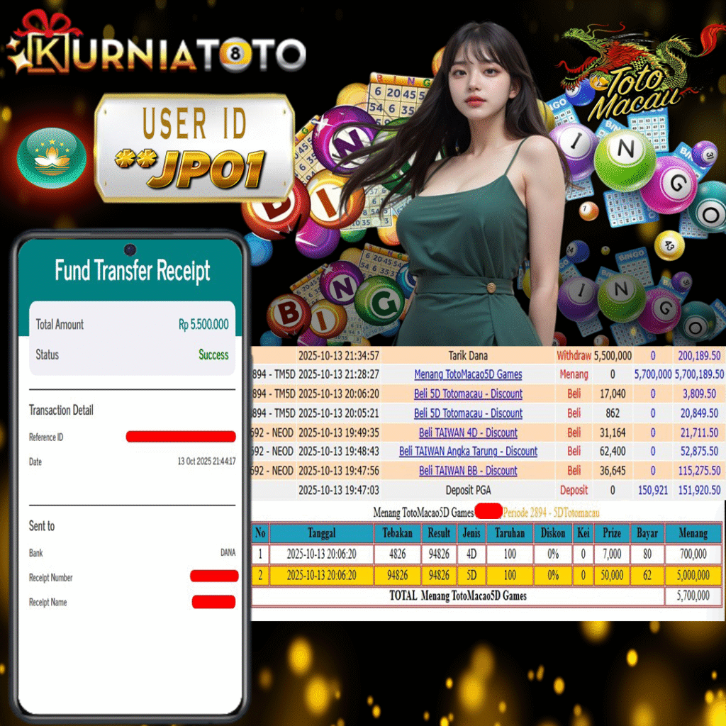 Selamat kepada member setia KURNIATOTO ID **JP01 Telah menang dalam permainan TOTO MACAU 5D RP 5,500,000, – LUNAS langsung mendarat ke rekening tanpa bertele – tele atau syarat apapun. Kami ucapkan terimakasih telah mempercayakan KURNIATOTO sebagai situs bandar terpercaya yang dijamin aman dikarenakan berapapun kemenangan member pasti LUNAS!