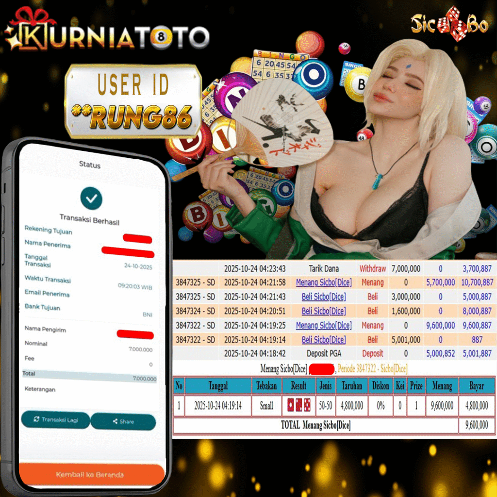 Selamat kepada member setia KURNIATOTO ID **RUNG86 Telah menang dalam permainan LIVE GAMES SICBO [DICE] RP 7,000,000, – LUNAS langsung mendarat ke rekening tanpa bertele – tele atau syarat apapun. Kami ucapkan terimakasih telah mempercayakan KURNIATOTO sebagai situs bandar terpercaya yang dijamin aman dikarenakan berapapun kemenangan member pasti LUNAS!