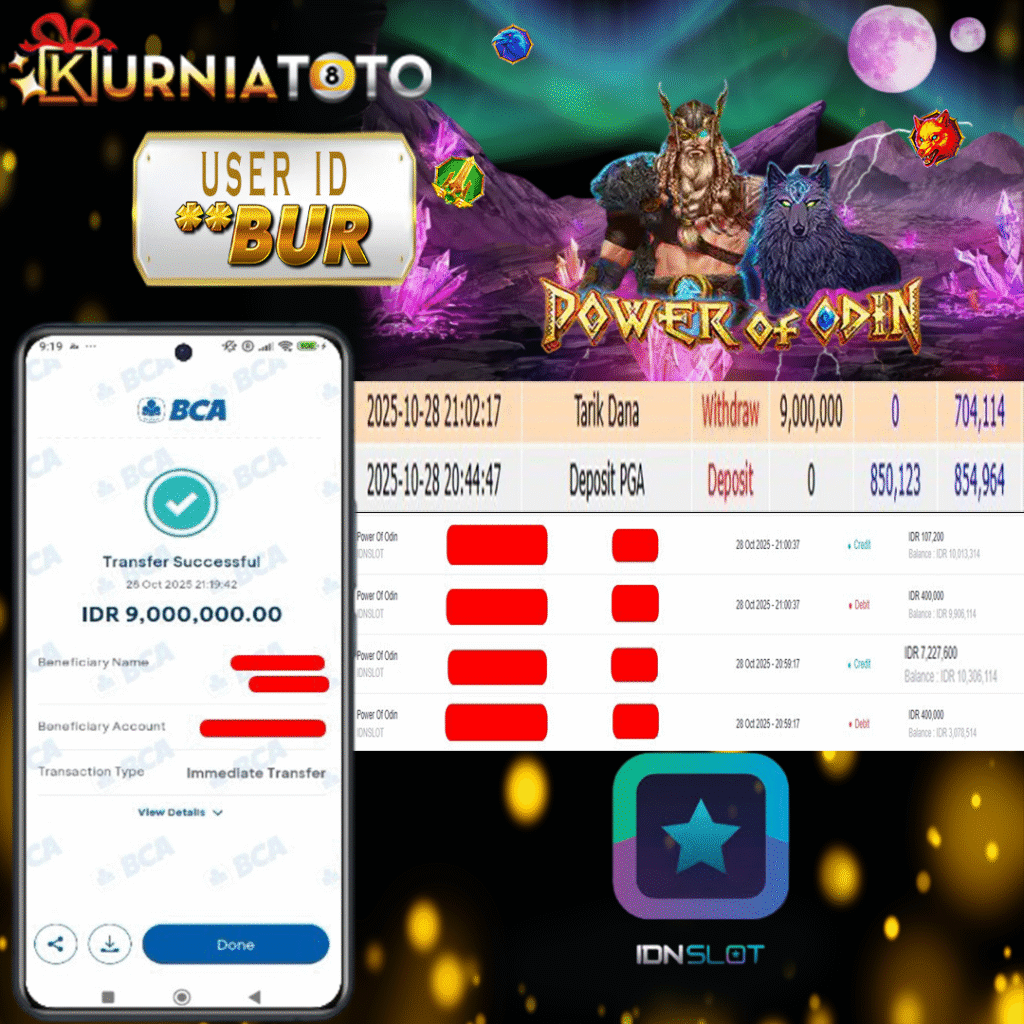 Selamat kepada member setia KURNIATOTO ID **BUR Telah menang dalam permainan SLOT POWER OF ODIN RP 9,000,000, – LUNAS langsung mendarat ke rekening tanpa bertele – tele atau syarat apapun. Kami ucapkan terimakasih telah mempercayakan KURNIATOTO sebagai situs bandar terpercaya yang dijamin aman dikarenakan berapapun kemenangan member pasti LUNAS!