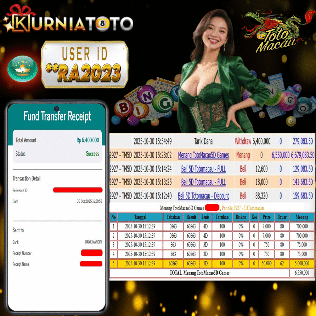 Selamat kepada member setia KURNIATOTO ID **RA2023 Telah menang dalam permainan TOTO MACAU RP 6,400,000, – LUNAS langsung mendarat ke rekening tanpa bertele – tele atau syarat apapun. Kami ucapkan terimakasih telah mempercayakan KURNIATOTO sebagai situs bandar terpercaya yang dijamin aman dikarenakan berapapun kemenangan member pasti LUNAS!