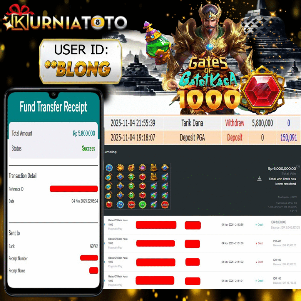 Selamat kepada member setia KURNIATOTO ID **BLONG Telah menang dalam permainan SLOT GATES OF GATOTKACA 1000 RP 5,800,000, – LUNAS langsung mendarat ke rekening tanpa bertele – tele atau syarat apapun. Kami ucapkan terimakasih telah mempercayakan KURNIATOTO sebagai situs bandar terpercaya yang dijamin aman dikarenakan berapapun kemenangan member pasti LUNAS!