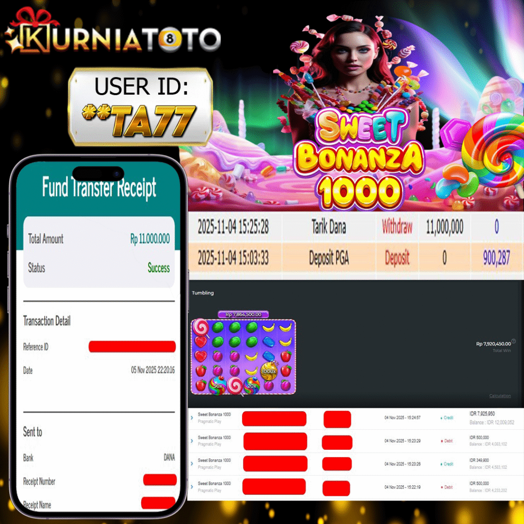 Selamat kepada member setia KURNIATOTO ID **TA777 Telah menang dalam permainan SLOT SWEET BONANZA 1000 RP 11,000,000 – LUNAS langsung mendarat ke rekening tanpa bertele – tele atau syarat apapun. Kami ucapkan terimakasih telah mempercayakan KURNIATOTO sebagai situs bandar toto togel online terpercaya yang dijamin aman dikarenakan berapapun kemenangan member pasti LUNAS!