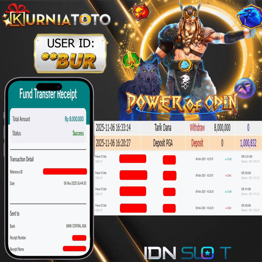 Selamat kepada member setia KURNIATOTO ID **BUR Telah menang dalam permainan SLOT POWER OF ODIN RP 8,000,000, – LUNAS langsung mendarat ke rekening tanpa bertele – tele atau syarat apapun. Kami ucapkan terimakasih telah mempercayakan KURNIATOTO sebagai situs bandar terpercaya yang dijamin aman dikarenakan berapapun kemenangan member pasti LUNAS!