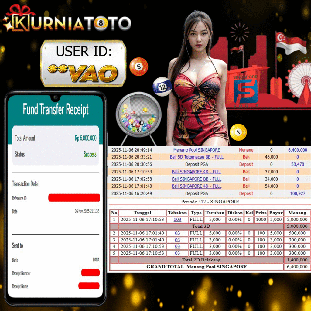 Selamat kepada member setia KURNIATOTO ID **VAO Telah menang dalam permainan SINGAPORE POOLS RP 6,000,000, – LUNAS langsung mendarat ke rekening tanpa bertele – tele atau syarat apapun. Kami ucapkan terimakasih telah mempercayakan KURNIATOTO sebagai situs bandar terpercaya yang dijamin aman dikarenakan berapapun kemenangan member pasti LUNAS!