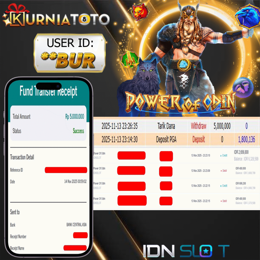 Selamat kepada member setia KURNIATOTO ID **BUR Telah menang dalam permainan SLOT POWER OF ODIN RP 5,000,000, – LUNAS langsung mendarat ke rekening tanpa bertele – tele atau syarat apapun. Kami ucapkan terimakasih telah mempercayakan KURNIATOTO sebagai situs bandar terpercaya yang dijamin aman dikarenakan berapapun kemenangan member pasti LUNAS!