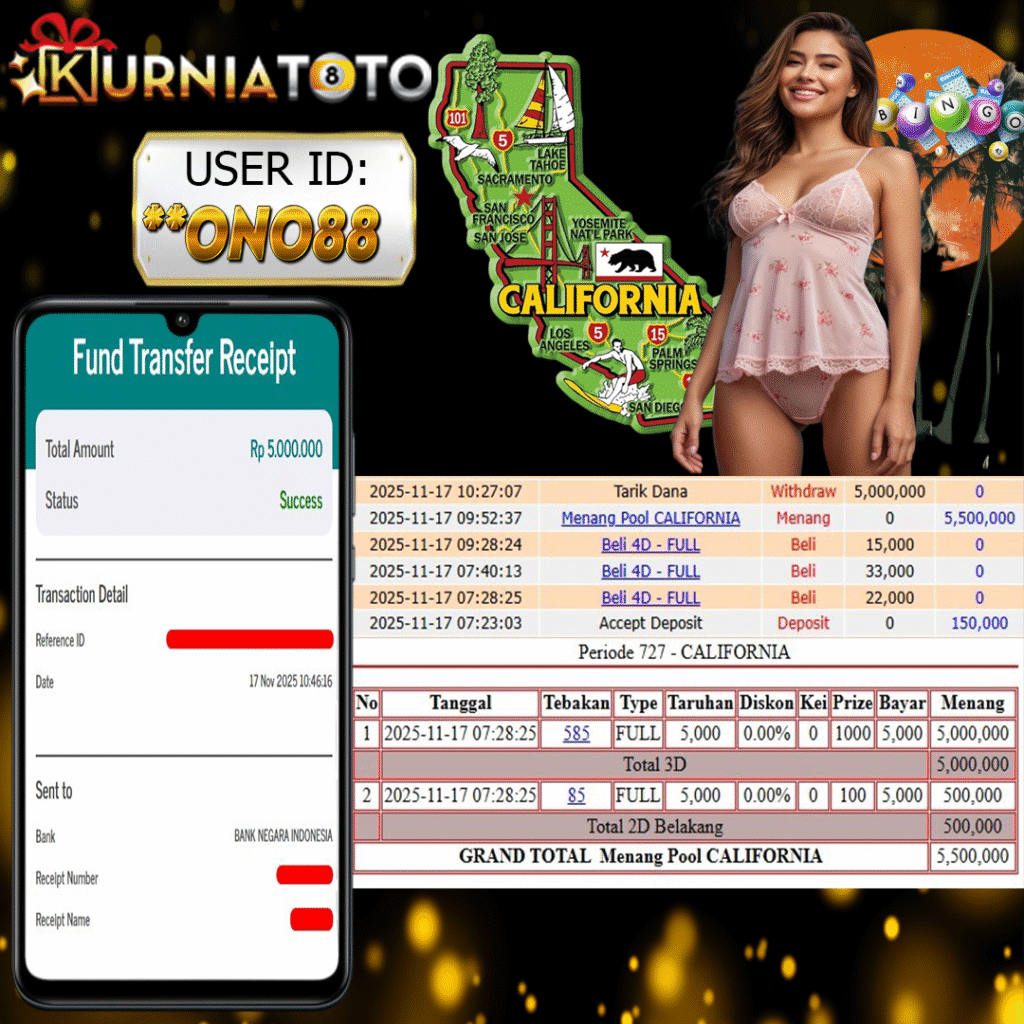 Selamat kepada member setia KURNIATOTO ID **ONO88 Telah menang dalam permainan CALIFORNIA POOLS RP 5,000,000, – LUNAS langsung mendarat ke rekening tanpa bertele – tele atau syarat apapun. Kami ucapkan terimakasih telah mempercayakan KURNIATOTO sebagai situs bandar terpercaya yang dijamin aman dikarenakan berapapun kemenangan member pasti LUNAS!