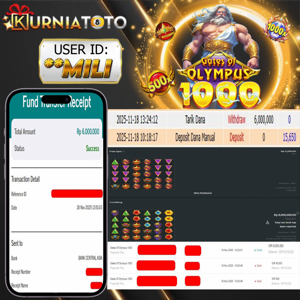 Selamat kepada member setia KURNIATOTO ID **MILI Telah menang dalam permainan SLOT GATES OF OLYMPUS 1000 RP 6,000,000, – LUNAS langsung mendarat ke rekening tanpa bertele – tele atau syarat apapun. Kami ucapkan terimakasih telah mempercayakan KURNIATOTO sebagai situs bandar terpercaya yang dijamin aman dikarenakan berapapun kemenangan member pasti LUNAS!