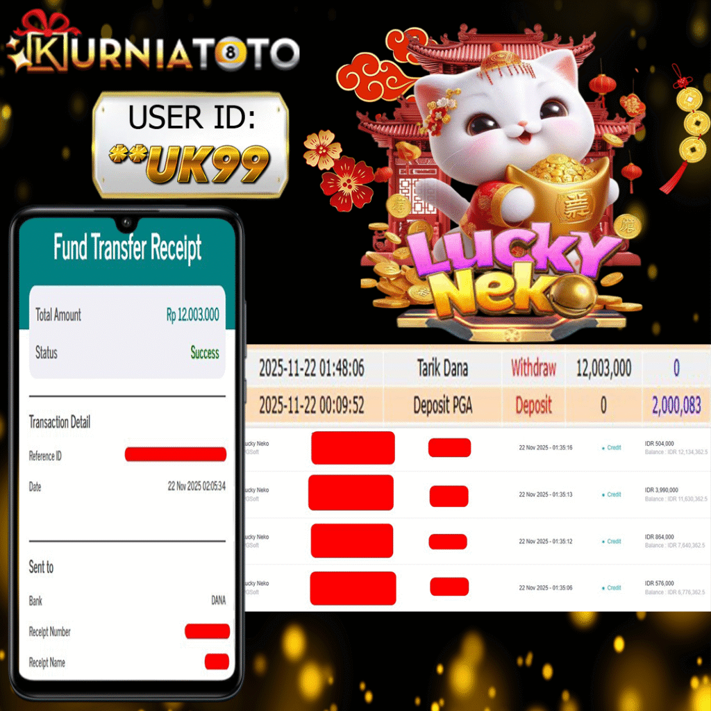 Selamat kepada member setia KURNIATOTO ID **UK99 Telah menang dalam permainan SLOT LUCKY NEKO RP 12,003,000, – LUNAS langsung mendarat ke rekening tanpa bertele – tele atau syarat apapun. Kami ucapkan terimakasih telah mempercayakan KURNIATOTO sebagai situs bandar terpercaya yang dijamin aman dikarenakan berapapun kemenangan member pasti LUNAS!