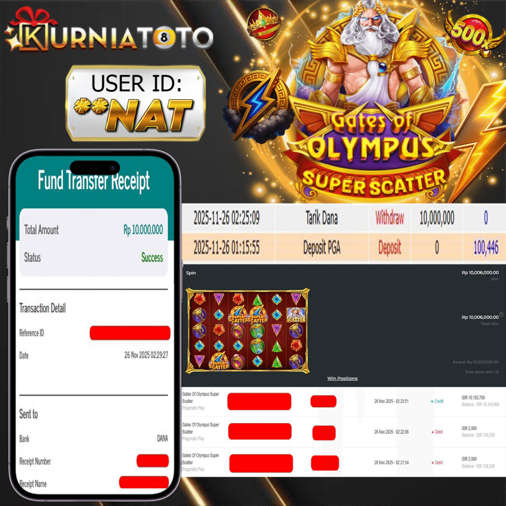 Selamat kepada member setia KURNIATOTO ID ***NAT Telah menang dalam permainan SLOT GATES OF OLYMPUS SUPER SCATTER RP 10,000,000, – LUNAS langsung mendarat ke rekening tanpa bertele – tele atau syarat apapun. Kami ucapkan terimakasih telah mempercayakan KURNIATOTO sebagai situs bandar terpercaya yang dijamin aman dikarenakan berapapun kemenangan member pasti LUNAS!
