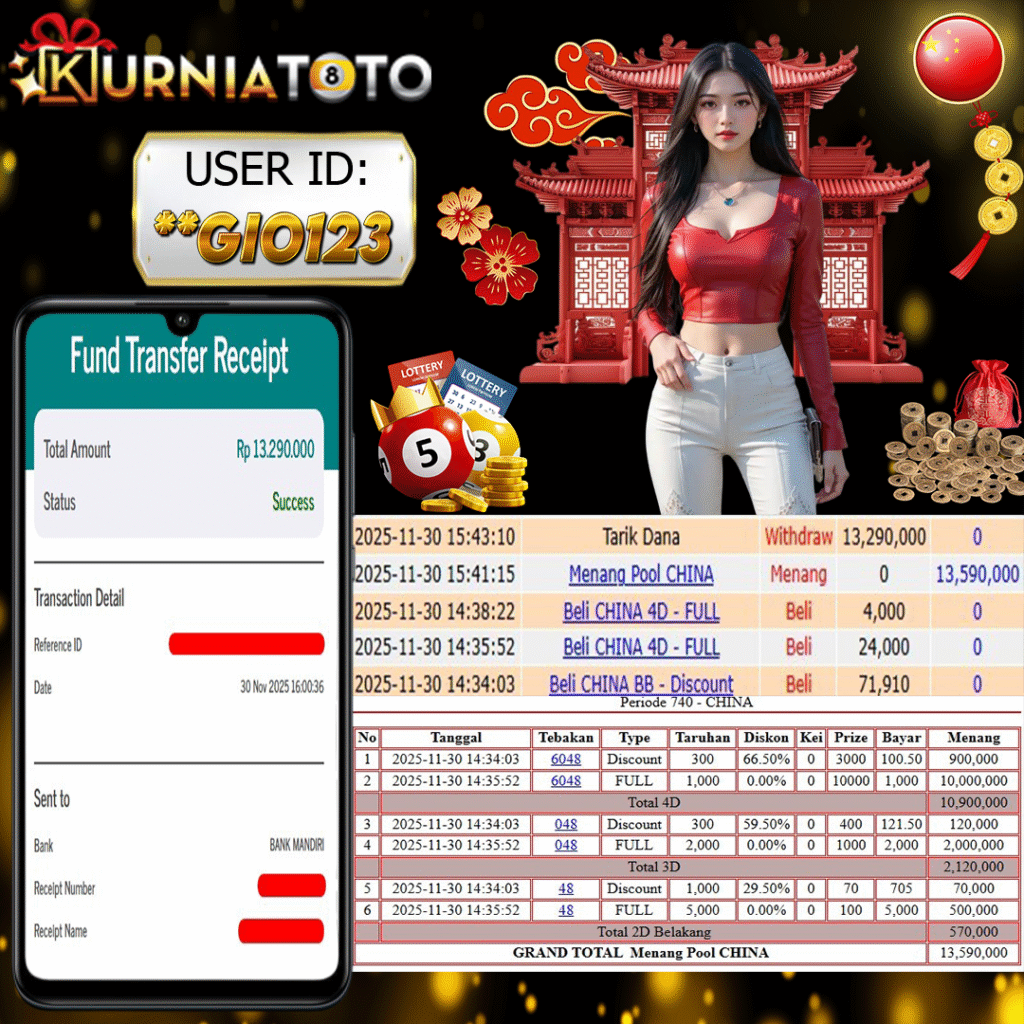 Selamat kepada member setia KURNIATOTO ID **GIO123 Telah menang dalam permainan CHINA POOLS RP 13,290,000, – LUNAS langsung mendarat ke rekening tanpa bertele – tele atau syarat apapun. Kami ucapkan terimakasih telah mempercayakan KURNIATOTO sebagai situs bandar terpercaya yang dijamin aman dikarenakan berapapun kemenangan member pasti LUNAS!