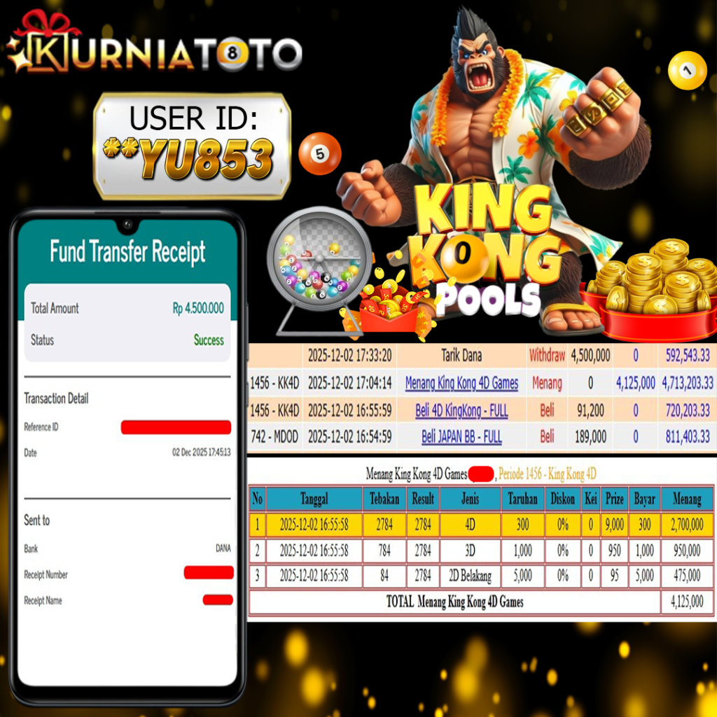 Selamat kepada member setia KURNIATOTO ID **YU853 Telah menang dalam permainan KING KONG 4D POOLS RP 4,500,000, – LUNAS langsung mendarat ke rekening tanpa bertele – tele atau syarat apapun. Kami ucapkan terimakasih telah mempercayakan KURNIATOTO sebagai situs bandar terpercaya yang dijamin aman dikarenakan berapapun kemenangan member pasti LUNAS!
