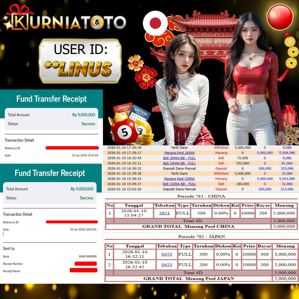 Selamat kepada member setia KURNIATOTO ID **LINUS Telah menang dalam permainan JAPAN POOLS & CHINA POOLS RP 10,000,000, – LUNAS langsung mendarat ke rekening tanpa bertele – tele atau syarat apapun. Kami ucapkan terimakasih telah mempercayakan KURNIATOTO sebagai situs bandar terpercaya yang dijamin aman dikarenakan berapapun kemenangan member pasti LUNAS!