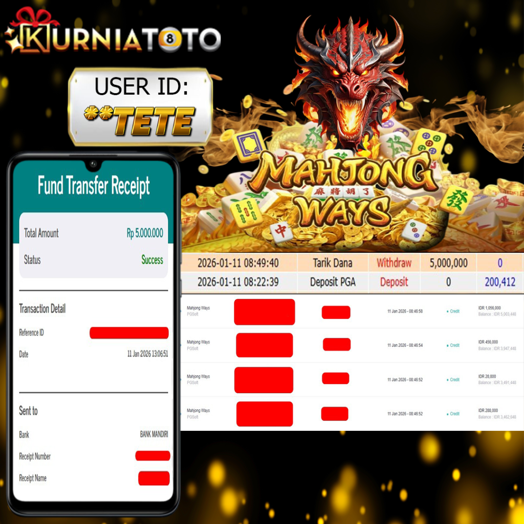 Selamat kepada member setia KURNIATOTO ID **TETE Telah menang dalam permainan SLOT MAHJONG WAYS RP 5,000,000, – LUNAS langsung mendarat ke rekening tanpa bertele – tele atau syarat apapun. Kami ucapkan terimakasih telah mempercayakan KURNIATOTO sebagai situs bandar terpercaya yang dijamin aman dikarenakan berapapun kemenangan member pasti LUNAS!
